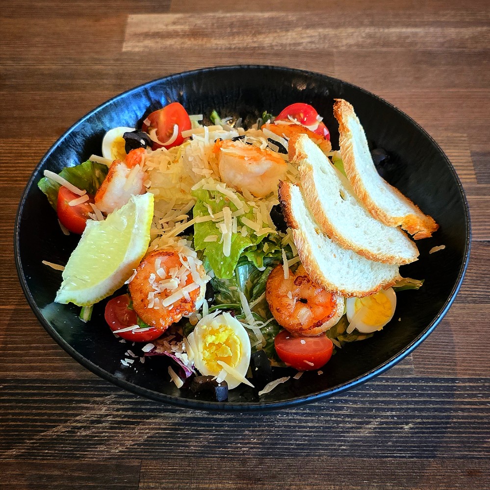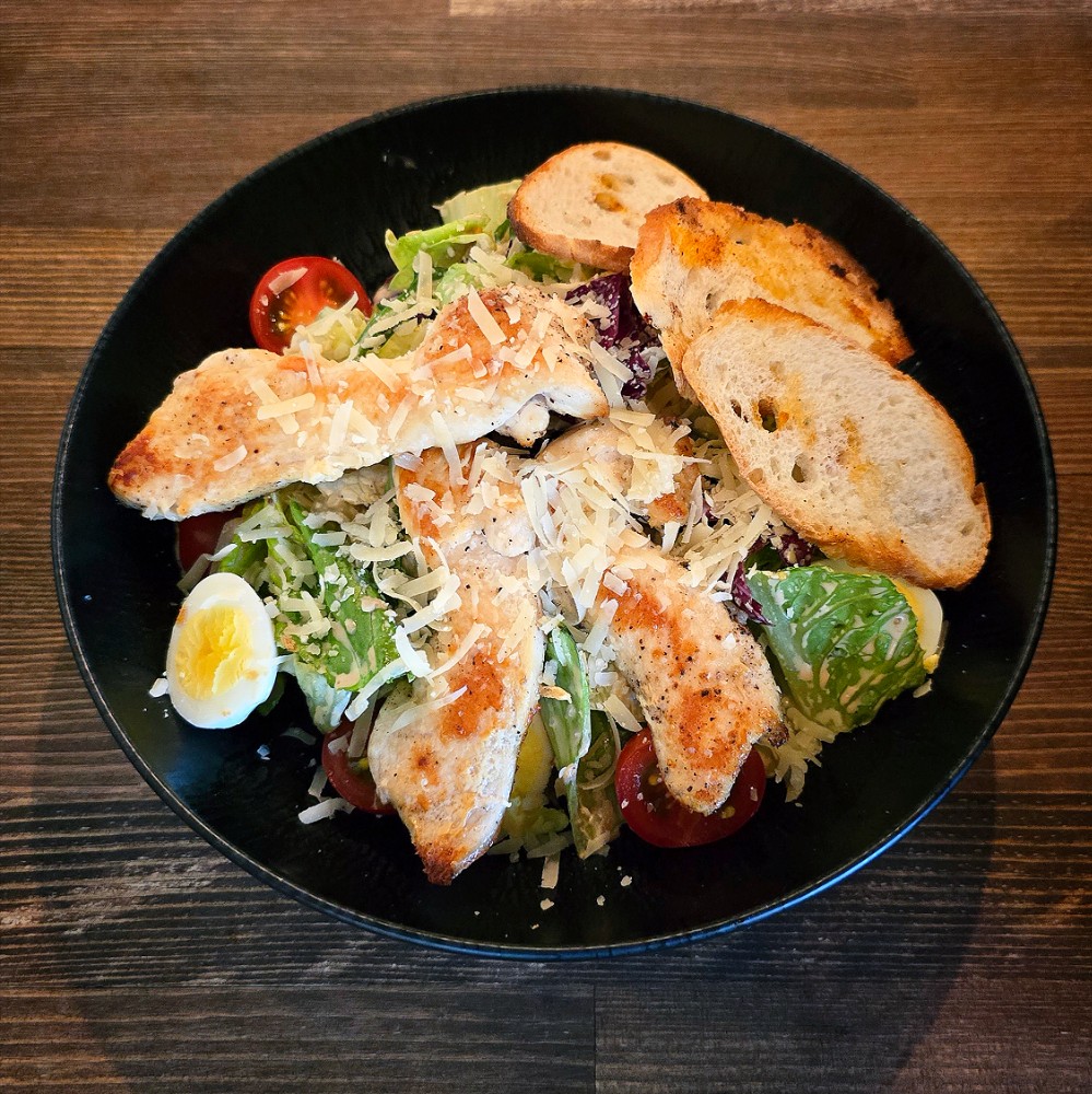 Салат з прошутто та беконом під сиром фета на подушці з салатів у фірмовому соусі.